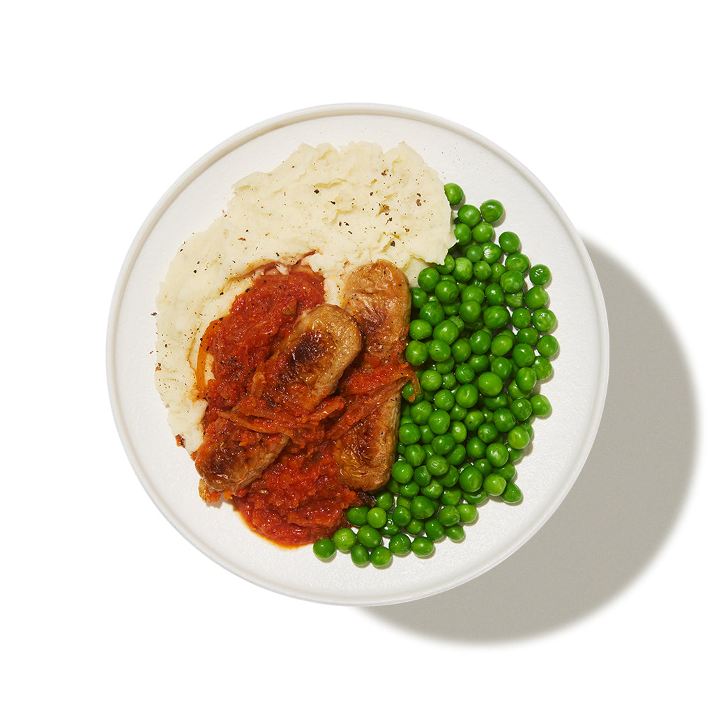 If you've been missing sausages, this dish is for you. Amazing plant-protein sausages paired with black garlic mashed potatoes, green peas, and a relish of slowly cooked onion, fennel and tomato. A classic made colourful – and plant-based.