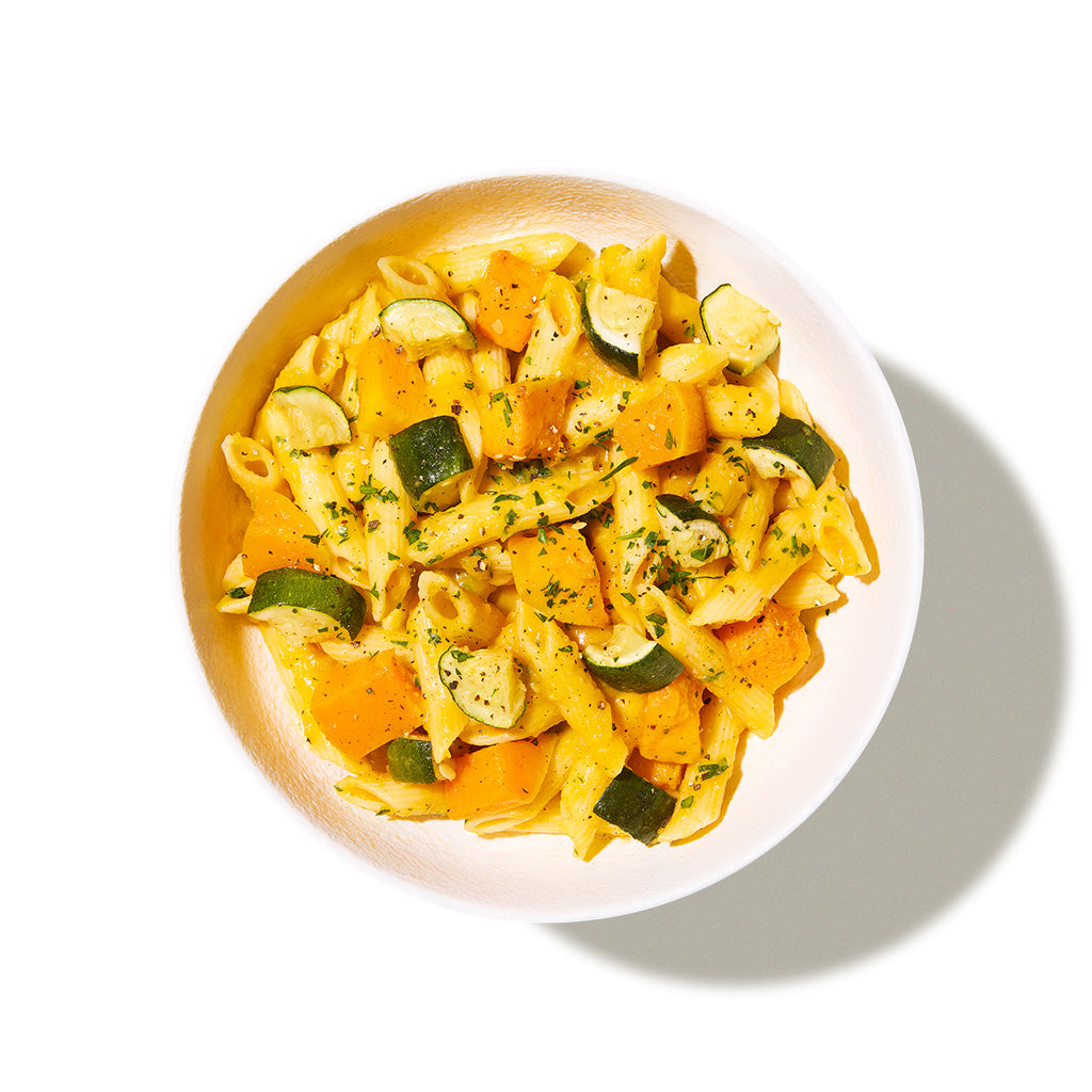 Pasta (37%) (Durum Wheat Semolina), Butternut Pumpkin (28%), Zucchini (14%), Plant Based Cream (5%) (Lentil Milk (Water, Lentil Protein), Vegetable Oil, Sugar, Modified Corn Starch, Emulsifiers (Sucrose, Esters Of Fatty Acids, Mono-and Diglycerides Of Fatty Acids, Sunflower Lecithin) Vegetable Gum (Guar Gum, Locust Bean Gum), Natural Flavours, Salt, Colour (Beta-carotene)), Pomegranate Molasses, Shallot, Olive Pomace Oil, Minced Garlic, Parsley (1%), White Wine, Salt, Vegetable Stock Powder, Corn Flour, Black Pepper.