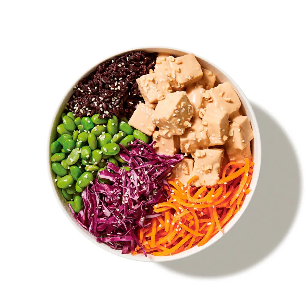 Firm Tofu (26%) (Water, Soybean, Firming Agent (516)), Black Rice (25%), Edamame (17%) (Soybean), Carrot, Red Cabbage (7%), Peanut Butter (6%) (Roasted Peanuts, Sugar, Vegetable Oils, Salt, Stabiliser (Mono and Diglycerides)), Lemon Juice, Coconut Amino, Soy Sauce, Tahini (Ground Sesame Seed), Minced Ginger, Minced Garlic, Sesame Seeds.